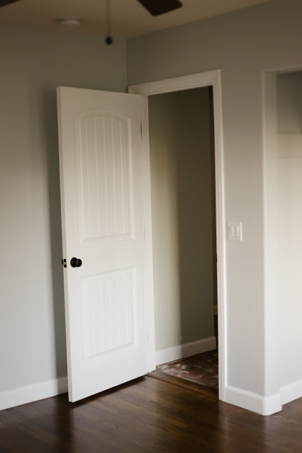 Standing in the living room, looking into the dining room.  OPEN! And the small mud room/hallway to the garage. We really love how this turned out. If you look up, you can see where we popped up the ceiling a bit, and added some crown. This little pop up adds so much height to the room. One of the best decisions we made! We did  similar pop up in the living room too.